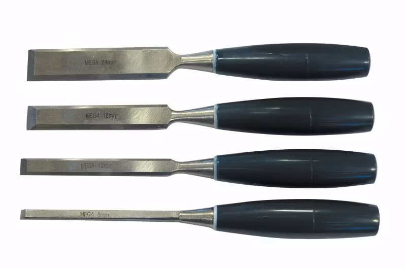 Stämjärnssats, stämjärn för trä/snickare, trähandtag, 4 delar i plastettui - 6mm,12mm,18mm, 24mm